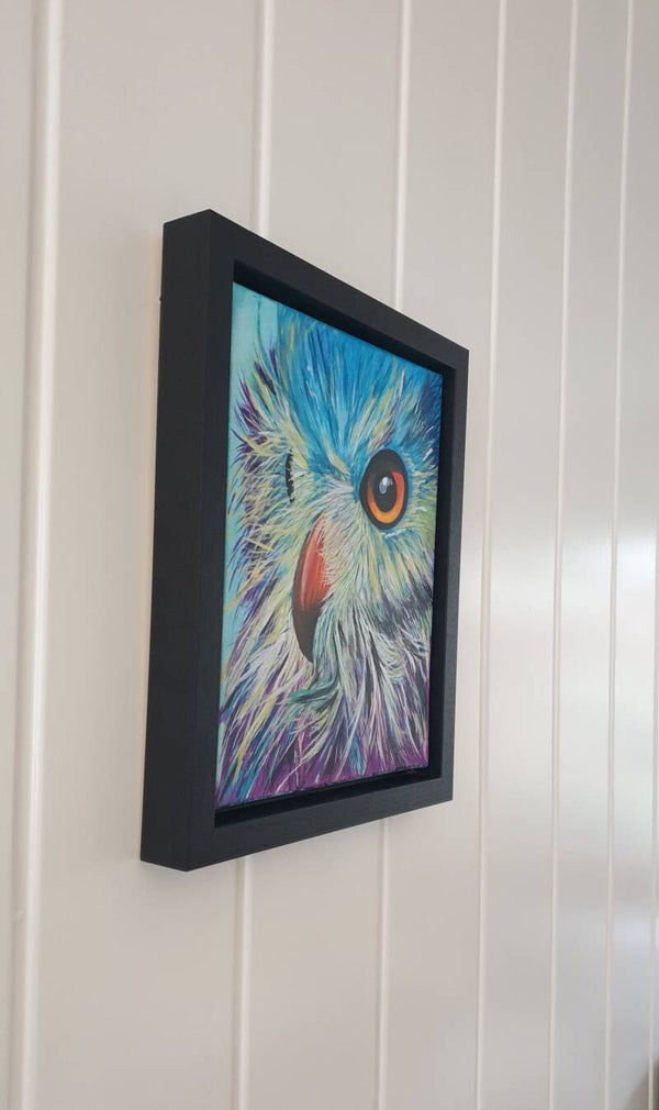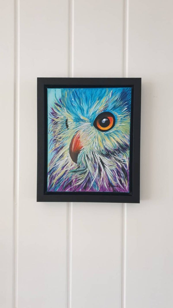 Deze uil /oehoe is geschilderd met acrylverf op een canvas doek van 23x29 cm. Hij wordt geleverd met mooie zwarte baklijst. Totale afmeting is 29x35 cm.